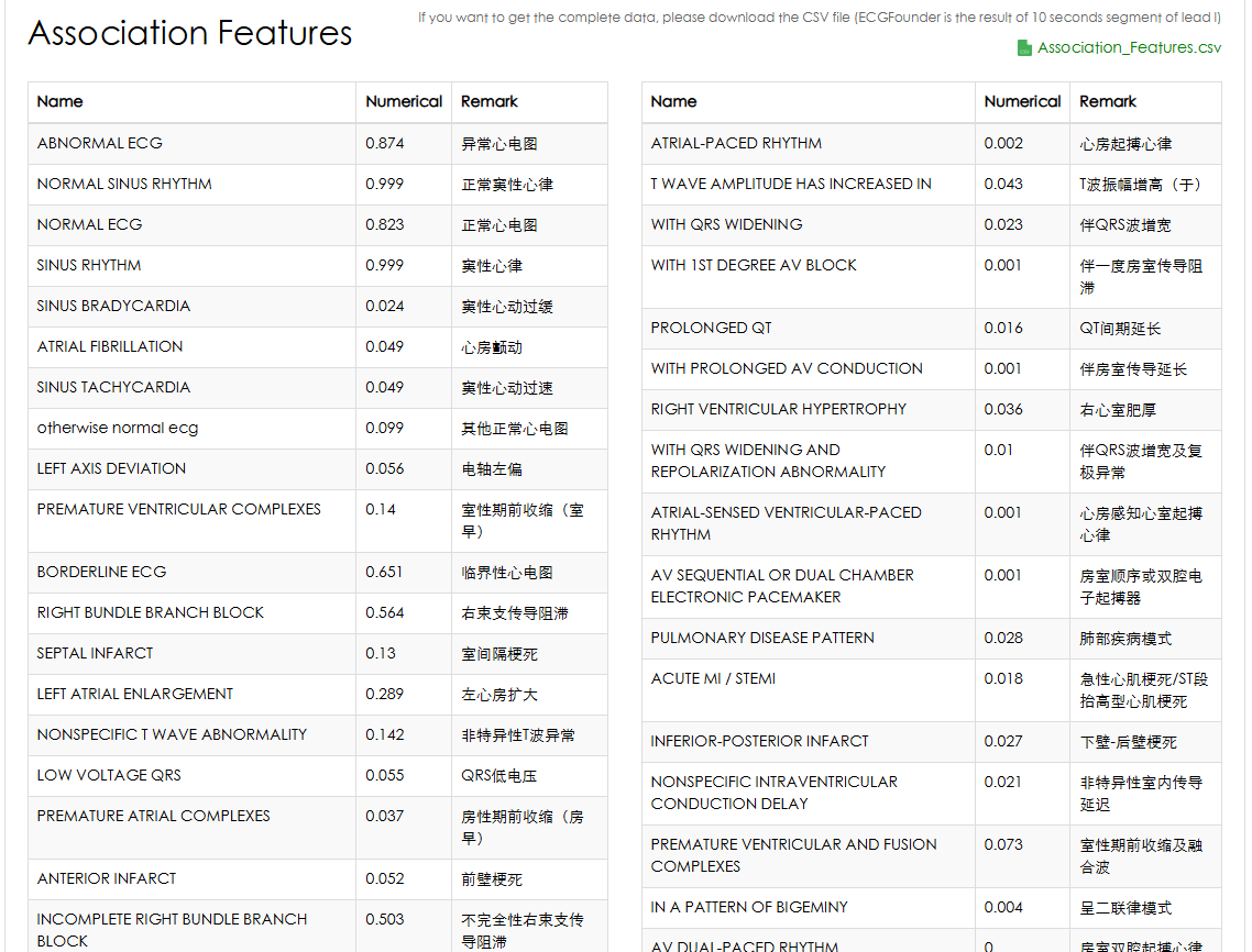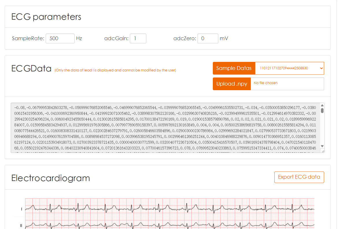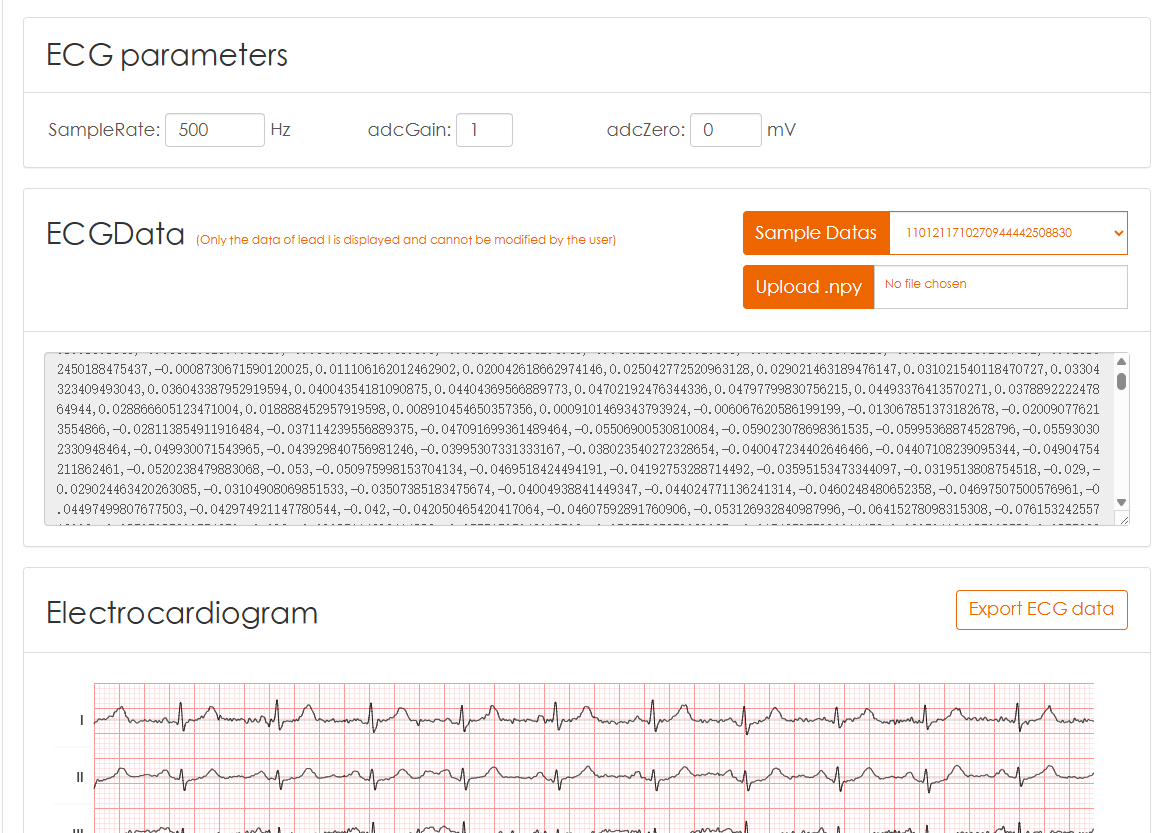 📖 Laboratory API ReferenceECG Omics Usage GuideOn this pageECG Omics Usage Guide Web demo usage instructions Demo URL: http://183.162.233.24:10024/ECGOmics Page content Usage steps 1. Select a sample file or upload an .npy file 2. Click the “Generate ECGomics” button 3. View the generated results or download the corresponding CSV file